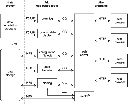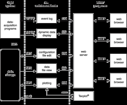 The clients and test engineers of the laboratory have access to all of the facility's data-acquisition, storage and visualization systems through Perl CGI programs running under Apache (see Figure 1). Much of the control of the experiment by the wind tunnel operators is also handled the same way. When a user opens the web browser on any of the computers in the control room, the wind tunnel client home page is automatically loaded. This page allows access to the five web-based software tools I have written so far: plotting, configuration file editing, data file viewing, event logging and the dynamic data display (see Resources). In addition, there are also links to local resources such as system documentation and a unit-conversion calculator, as well as to off-site information. I'd like to point out that the laboratory uses a rather restrictive intranet model that helps to alleviate some of the security concerns of running web-based systems.