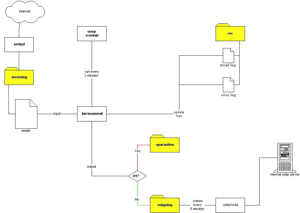 At this point, if no viruses have been found, the e-mail is moved over to the outgoing directory where it is delivered to the internal e-mail server by smtpfwdd. smtpfwdd scans the outgoing directory for mail to deliver every five minutes.