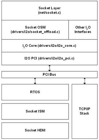The socket OSM replaces the INET socket layer. All socket-related requests passed from the socket layer are converted into I2O messages, which are passed to the ISM on the IOP.