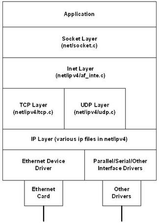 As shown in Figure 3, Linux network components consist of a layered structure. User-space programmers access network services via sockets, using the functions provided by the Linux socket layer. The socket structure defined in include/linux/net.h forms the basis for the implementation of the socket interface. Below the user layer is the INET socket layer. It manages the communication end points for the IP-based protocols, such as TCP and UDP. This layer is represented by the data structure sock defined in include/net/sock.h. The layer underneath the INET socket layer is determined by the type of socket and may be the UDP or TCP layer or the IP layer directly. Below the IP layer are the network devices, which receive the final packets from the IP layer.