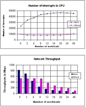 The benchmark tests that were run using the prototype showed that the offloading of the TCP/IP stack significantly reduced both CPU utilization and the number of interrupts to the host processor. With a heavily loaded machine, the offloaded stack was able to maintain overall network performance and host CPU cycles were able to remain dedicated to the workload applications. In a native machine, the host processors were interrupted far more frequently, and the network application suffered from CPU resource starvation resulting in the network performance degradation.