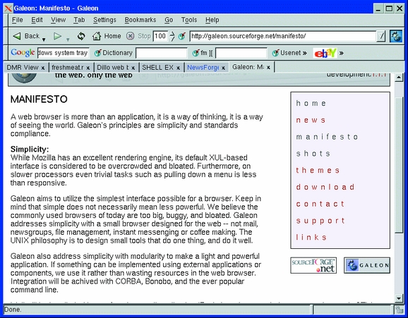 Galeon's motto is “The web, only the web”, and Galeon is meant to be only a web browser, not an all-in-one web tool. It is based on Mozilla code and requires Mozilla to be installed before it can be used. This was one of the first Mozilla-based browsers, and its maturity shows in the features provided. One such feature is the Smart Bookmarks, which have their own toolbar and allow the user to do things such as search Freshmeat II, Google and Google's news archive. Another nice feature is the Settings menu on the top menubar that allows easy access to such settings as proxies, animation control and JavaScript.