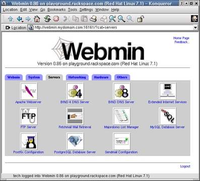 To quote their web site, “Webmin is a web-based interface for system administration for Unix.” I found Webmin a few years ago when I was looking to register the domain webmin.com. I had an idea for a cool control panel to help administer my Linux server farm, and I was annoyed that someone had gotten to the domain first, until I started looking at the software they had for downloading. After that I was hooked.