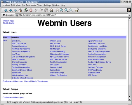 If that were all Webmin had to offer, I would be quite impressed. There is one final benefit of the Webmin architecture, however. Webmin works directly with all the files on the system to affect its changes, meaning it does not use a database or other means of storing information that is in any way nonstandard. I can therefore edit the httpd.conf for Apache by hand without worrying that it will cause problems for Webmin. From a support standpoint, this means I can install Webmin on a server and turn it over to someone else. If that person problems I still can use all of my scripts and vi knowledge to troubleshoot the problem.