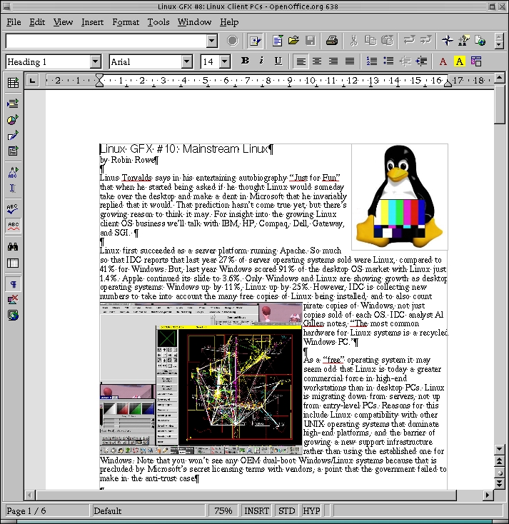 For the desktop, Microsoft Office has become the dam holding back a Linux flood. A significant alternative to Microsoft Office is StarOffice. Sun Microsystems spent $74 million acquiring StarOffice as a product to give away for free, then further confounded business analysts by announcing last year that it would make version 6.0 GPL, open sourcing nine million lines of code. Due for release in October 2001, OpenOffice 6.0 should be available by the time you read this. Anticipated enhancements include making the annoying integrated desktop feature optional, improved compatibility with Microsoft Office file formats and support for Chinese, Japanese and Korean.