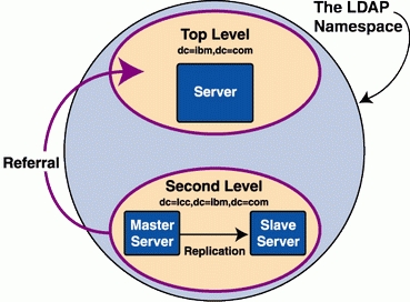 LDAP, like any good network service, is designed to run across multiple servers. LDAP uses two major features: replication and referral. The referral mechanism lets you split the LDAP namespace across multiple servers and arrange LDAP servers in a hierarchy. LDAP allows only one master server for a particular directory namespace (see Figure 1).