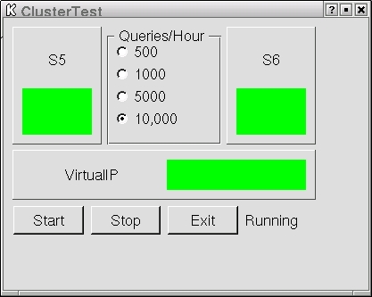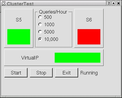 We can now start Heartbeat on both servers. The Heartbeat documentation includes some information about testing the basic setup, so we won't repeat that. With two heartbeat media, Ethernet and serial, connected, you should see six heartbeat processes running. To verify failover, we did several tests. To provide a client for testing, we created a simple KDE application that queries the servers and displays the state of the connection. A real client would query only the virtual IP in this instance, but we query all three IPs for illustration purposes. We send 10,000 queries per hour for this test (Figure 4).