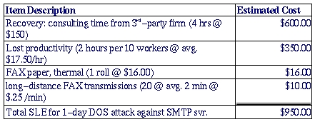 For example, suppose Mommenpop, Inc., a small business, wishes to calculate the ALE for denial-of-service (DOS) attacks against their SMTP gateway. Suppose further that e-mail is a critical application for their business; their ten employees use e-mail to bill clients, provide work estimates to prospective customers and facilitate other critical business communications. However, networking is not their core business, so they depend on a local consulting firm for e-mail-server support.