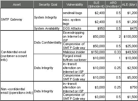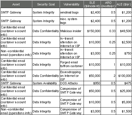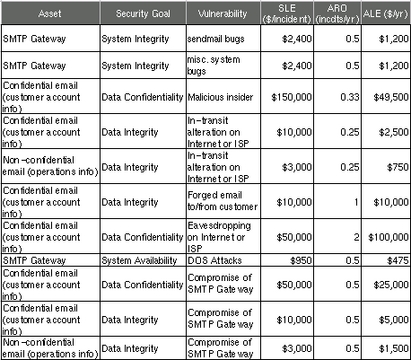 Figure 2 shows a more complete threat analysis for our hypothetical business' SMTP gateway, including not only the ALE we just calculated but also a number of others that address related assets, plus a variety of security goals.