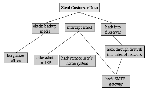 We see in this example that backup media are obtained most probably by breaking into the office; compromising the internal fileserver involves hacking in through a firewall, and there are three different avenues to obtain the data via intercepted e-mail. We also see that while compromising Mommenpop, Inc.'s SMTP server is the best way to attack the firewall, a more direct route would simply be to read e-mail passing through the compromised gateway.