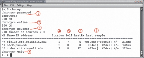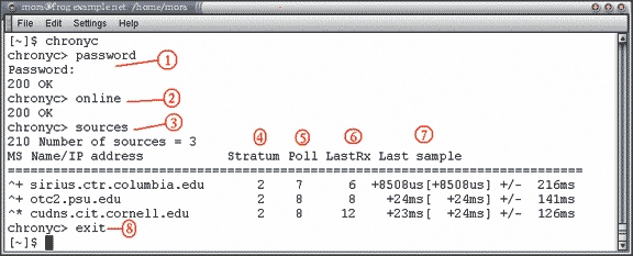 So now that chrony is installed, verify that chronyd runs in the background (start it if necessary). Remember that the configuration file specifies (with the offline keyword) that chronyd should not query the servers without your permission. Start your modem connection, verify that you are connected to your ISP and then start the chronyc client. Figure 2 shows a sample session.