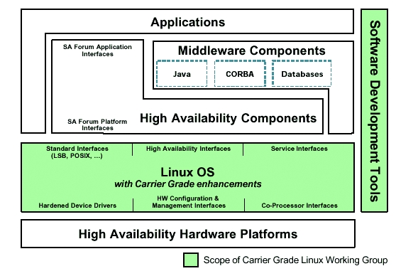 The group's initial focus is to collect market requirements and specify the architecture for a Carrier Grade Linux platform (see Figure 1) and also to encourage development of third-party components on top of Linux that implement the required functionality of the platform.