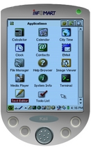 Infomart is trying for a high level of compatibility with Sharp's new Zaurus PDA, from both a UI and application software perspective. To accomplish this, they used the identical software stack: Lineo's Embedix Plus, Trolltech's Qt/Embedded and Qtopia, Opera's browser and Insignia's Jeode JVM. In an effort to minimize costs, however, the Kaii uses a 160MHz Hitachi SH3 processor and offers a soft (on-screen), rather than physical, keyboard.