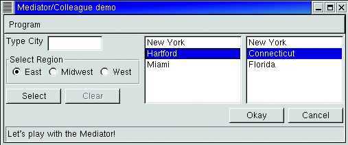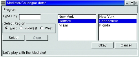 The interaction on the displayed window involves most of the controls. When you type a character in the text box, the program does some simple speed selection and highlights the first entry in the list box that matches. In addition, the Select and Clear buttons become enabled. If you select either a city or state, the complementary selection is made in the other list box. If you select a different region with the radio buttons, that action re-initializes the lists boxes, clears the text box and disables the Select and Clear buttons. Clicking on the Clear button alone clears the text box and disables itself. All of the interaction code is in the MainFrame class, and the controls are not coupled to one another.