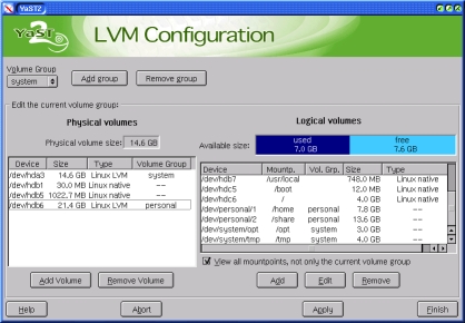 SuSE's YaST administration tool provides a GUI-based logical volume management interface. As mentioned earlier, I noticed YaST2 does not resize ReiserFS VG's properly. YaST1 works correctly.