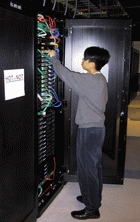 “HOTorNOT is a viable business built entirely on Linux”, Hong says. More specifically, “Linux (Red Hat), Apache, MySQL and PHP on 35 1U rackmounts, mostly from Rackable Systems.” (See picture.)