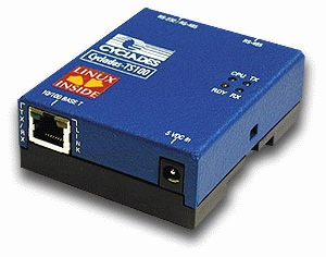 Cyclades Device Server: The Cyclades TS100 is a powerful yet highly compact device server used to connect various serial devices to a TCP/IP network. Typical applications include industrial automation and control, out-of-band network management, retail automation and connecting various types of serially interfaced devices to networks. The device provides interface ports for both 10/100Mb Ethernet and RS-232/RS-485 serial lines, allowing it to integrate legacy instruments and systems having serial interfaces to broadband networks using TCP/IP. Unlike its competitors, which are typically based on proprietary software models, the TS100's built-in embedded Linux OS and other open-source software make it easy to customize operation of the TS100. Although not much larger than a deck of playing cards (2.8" × 3.4" × 1.2"), the TS100 contains not just one but two microprocessors. This is possible thanks to the use of Motorola's MPC855T “PowerQUICC Integrated Communications Processor”. The MPC855T is a dual-core system-on-chip processor that includes a PowerPC core processor (running at 50MHz) plus a separate RISC engine specifically designed to off-load communication tasks. Memory resources consist of 16MB of SDRAM, plus a 4MB Flash disk from which the firmware is uncompressed and loaded into a RAM disk at boot time. The device's embedded Linux OS is based on a 2.2.14 kernel, along with a variety of open-source utilities including the GoAhead web server (for web-based setup and management of the device), Portslave, OpenSSH 3.1, crontab, BusyBox, net-tools, rsyncm and others. Cylades started from MontaVista's Hard Hat Linux 1.2 and added their own in-house customization. (See www.cyclades.com.)