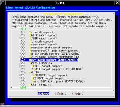Naturally you can select as many of the Netfilter modules as you like. They don't take up much disk space, and if compiled as modules they needn't be loaded unless necessary. The one we're most concerned with right now, though, is owner Match Support.