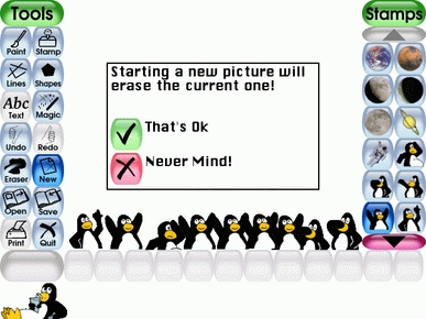 My kids love to play with the computers in the house. At four years old, both my daughters were logging in, playing games, even surfing the Web (barbie.com and cartoonnetwork.com have some great kids games). But they love to be creative and that means painting programs. When I want to see how good a program of this type is, I show my kids and let them go at it. If they're asking for it the next time they log in, I've got a winner. Requires: libSDL, libpthread, libSDL_image, libSDL_ttf, libSDL_mixer, libm, libesd (optional), libdl, libartsc, libX11, libXext, libjpeg, libpng, libz, libtiff, libfreetype, libvorbisfile, libvorbis, libogg, libsmpeg, glibc.