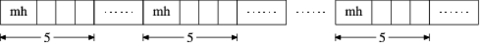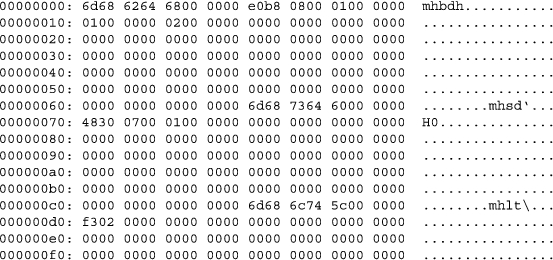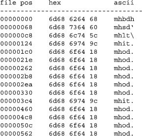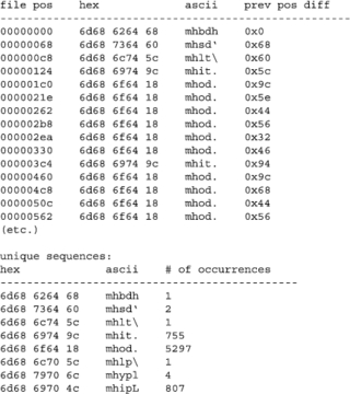 From only the first 256 bytes, a pattern emerges: three 5-byte sequences start with “mh” (0x6d68). When we scan the rest of the file, we find it littered with 5-byte mh sequences (see Figure 2). Based on the number of mh byte sequences we see in the file, we hypothesize that these sequences are a marker for a data structure. We don't know if the data structure has a fixed or varying size. Perhaps it is only five bytes long and the information between the mh sequences is composed of other data structures. To help us determine this information, we will extract the first 15 mh sequences from the file (Figure 3).