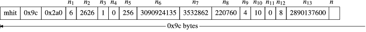 The children of the mhlt node are mhit nodes. The number of mhit nodes corresponds to the number of songs on the iPod. Dividing the first mhit chunk into 4-byte unsigned integers yields the diagram in Figure 12.