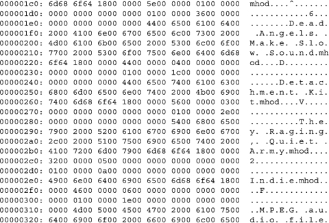 Perhaps by looking at the mhod children of the mhit chunks we can learn what the unknown mhit values signify. Indeed, a cursory look at some mhod chunks (see Figure 13) indicates they contain variable-length text after them.