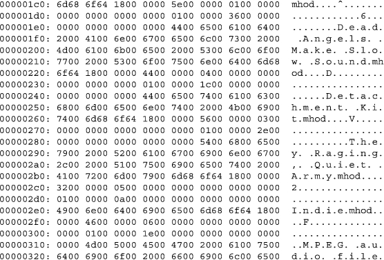 Although every file format contains repeated patterns, the trick is recognizing these patterns and learning how to parse them. Opening a file in a hex editor allows us to examine the raw data for patterns. Figure 1 contains the first 256 bytes of an iTunesDB file as shown by Emacs in hexl-mode. The first column is the file position; then there are eight columns, each column containing two bytes. The final column is the ever-helpful ASCII representation of the data.