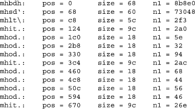 Our first validation program will display information (shown in Figure 4) about all the mh chunks in the file to help us find patterns. The first glaring pattern we see pertains to the difference between the file positions of the mh chunks. With the exception of the mhod chunks, the fifth byte contains the number of bytes until the next mh chunk. We can add code to our validation program to check this pattern, and we find that this is almost the case: there are a few chunks besides the mhod chunks that fail our test. It is unlikely that the creators of the iTunesDB file format would limit the size of a data structure to 256 bytes, thus we are probably dealing with a multibyte number.
