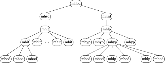 The n1 plus file position value for mhit, mhyp and mhip chunks is consistent with the one for mhbd, mhsd and mhod. Figure 8 contains an example of the relationship between these chunks. For mhlt and mhlp, the position at n1 plus the mhlt/mhlp file position is in the middle of a chunk. The n1 value for mhlt in this example is 755, which is the number of mhit chunks in the file. The n1 value for mhlp is 4, which is the number of mhyp chunks. These relationships suggest a nested data structure. If we use the n1 size to determine parent-child relationships between mh chunks, we can create the tree diagram shown in Figure 9. The symmetry looks too good to be wrong, so we'll stick with it as our theory unless we find data later on that convinces us otherwise.