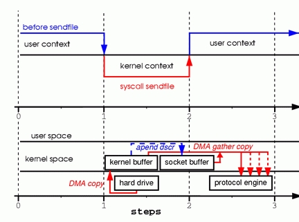 Looks simple enough; you would think there is not much overhead with only those two system calls. In reality, this couldn't be further from the truth. Behind those two calls, the data has been copied at least four times, and almost as many user/kernel context switches have been performed. (Actually this process is much more complicated, but I wanted to keep it simple). To get a better idea of the process involved, take a look at Figure 1. The top side shows context switches, and the bottom side shows copy operations.