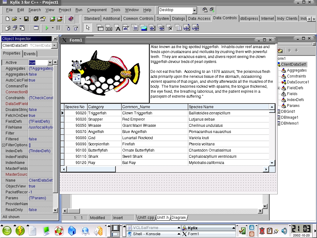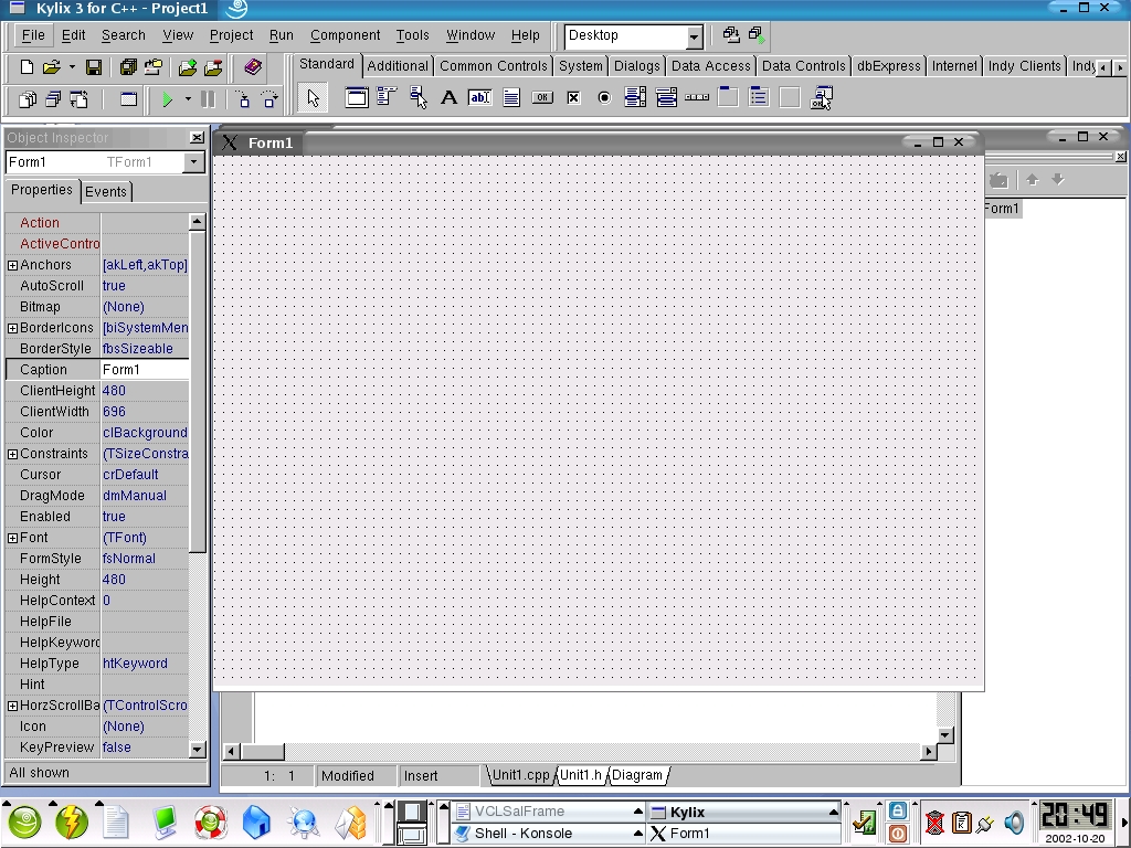After playing around with Kylix some more I found a few bugs in the software. When trying to assign images to components, the application would freeze. I am guessing it's possibly some sort of synchronization issue because attaching to the Kylix process with strace brought it back to life. I also found that the code-completion window sometimes refused to pop up. To put things in perspective I must say that Kylix was not certified to run on the distribution that I had freshly installed on my laptop. I used SuSE 8.1, although Kylix 3.0 was certified to run on SuSE 7.3.
