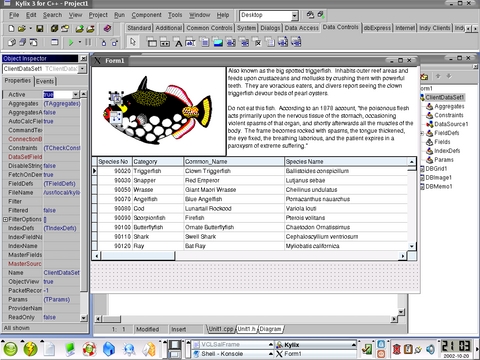 Kylix is a powerful RAD (rapid application development) tool. All three flavors of Kylix 3.0 (Open, Professional and Enterprise) come with both C++ and Delphi (Pascal) compilers. The Enterprise edition I reviewed comes with more than 190 components for rapid application development. On top of generic GUI-building components, it also comes with Borland's dbExpress architecture, which enables native access to DB2, Oracle9i, Informix, Informix SE, InterBase, MySQL and PostgreSQL databases. It also comes with BizSnap, WebSnap and DataSnap components, which enable easy development of web services that interoperate with enterprise databases.