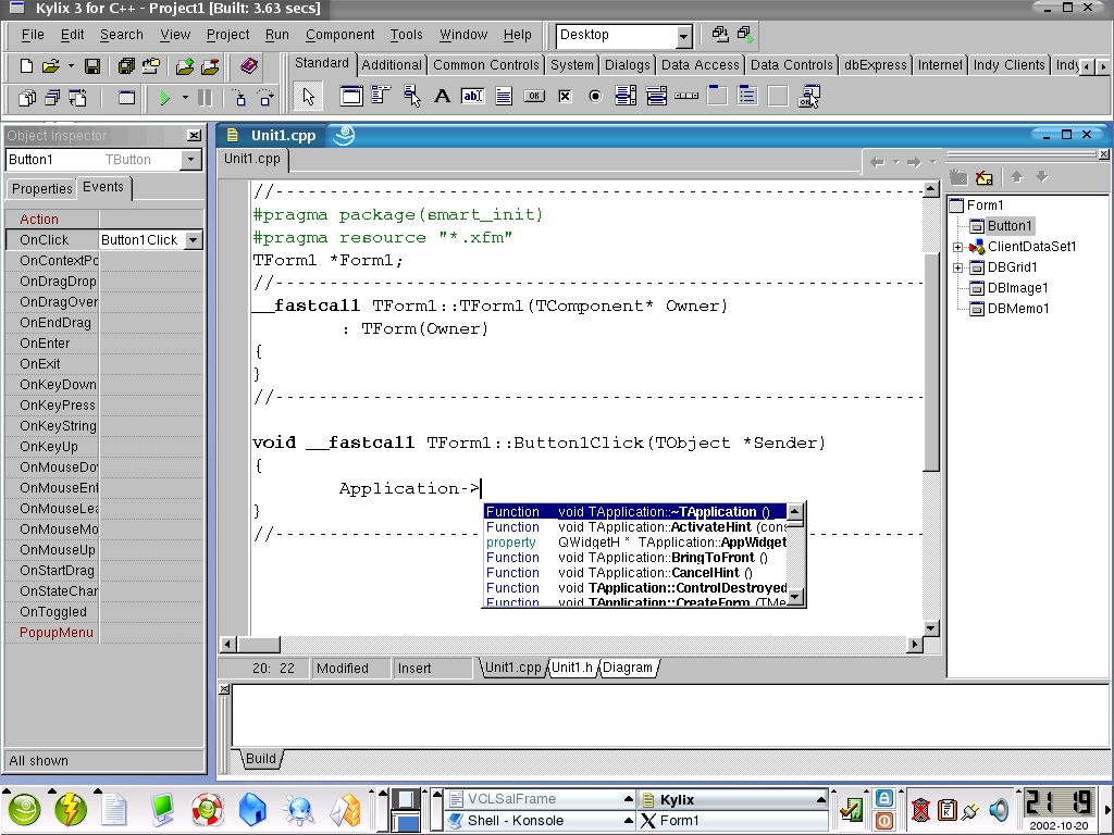 After clicking around I decided that I wanted to see how the actual coding experience is with the tool. I grabbed a button from the component bar and placed it onto my form (application main window). When I double-clicked this button, the Object Inspector switched to the Events tab and selected the OnClick event. Meanwhile in the code editor, a code framework for the click event was built. My keyboard focus was placed at the function block start, ready for code entry. I wanted the application to close when I clicked the button that I just placed on the form. I started typing “Application->” and a small window popped up in the editor. It listed all the functions and properties of my application instance called “Application” (Figure 3).