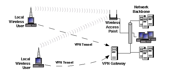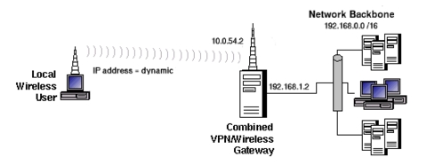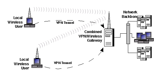 Returning to Figure 2, note that a single system can serve as a combined VPN/wireless gateway. Figure 3 shows an equally valid topology: the wireless and VPN gateways are separate devices.