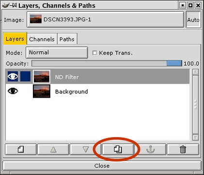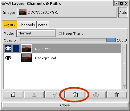 In the original image, open the Layers dialog (Ctrl-L). In that dialog, right-click on the Background layer name and select Duplicate, or use the button circled in Figure 10. Now double-click on the duplicate layer and rename the new layer ND Filter. This step is not strictly necessary, but it is helpful to prevent confusion about what is on each layer, especially if you open this file again six months later and are trying to figure out what you did. At this point, your Layers dialog should look something like Figure 10.
