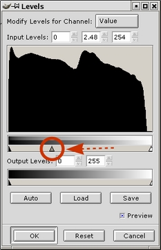 In the Layers dialog, select the ND Filter layer. Go to the image window and perform any editing you want to enhance highlight or shadow detail. The Levels (RC-->Image->Colors-->Levels) or Curves (RC-->Image-->Colors-->Curves) operations are good choices for this, but you can also use Brightness/Contrast (RC-->Image-->Colors-->Brightness and Contrast), the dodge/burn tools or anything else that works for you. We are working on the duplicate layer so don't worry about the good part of the image; let it go too dark or too light. Concentrate on the area that needs improvement. In this case I've used Levels (moved the middle slider to the left a bit, as shown in Figure 11) to lighten the whole image until the foreground is about where I want it.