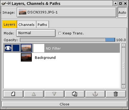 At this point you will be in the position illustrated by Figure 6, where you can see your lightened image, which obscures the original image below it. We now want to add a layer mask that will reveal the upper part of the lower image. In the Layers dialog, right-click on the ND Filter layer and select Add Layer Mask. In the Add Mask Options dialog, select White (Full Opacity) and click OK. Finally, click the eye next to the Background layer in the Layers dialog to turn off visibility of the Background layer. Your Layers dialog should now look like Figure 12, with a little white layer mask icon next to the layer image icon on the ND Filter layer.