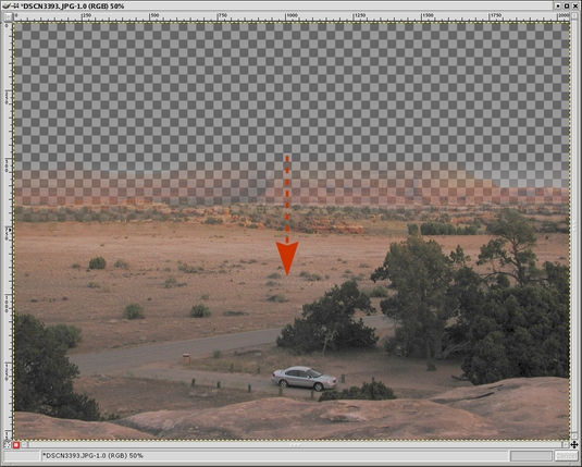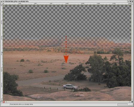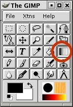 Go up to the main GIMP toolbox window and select the gradient fill tool, circled in Figure 13. Go back to the image window and click-drag a line in the angle and direction that you want the split between the upper and lower layers (lower layer at the beginning of the drag, upper layer at the end). The length of the line that you drag determines how graduated or abrupt the transition will be, and the resulting blend. Experiment to get a feel for it, but generally you will want a short stroke centered over the transition zone (e.g., horizon). Because we turned off visibility of the background, your feedback will be immediate, as shown in Figure 14; a portion of the image should disappear just past the transition zone. If you didn't get the split at the right place simply click-drag another line, and the new gradient fill will replace the old. To get an idea of what you are doing, refer back to the gradient in Figure 7. You can see a miniature version of your gradient in the layer mask icon in the Layers dialog. Remember, the gradient fill affects the transparency of the upper layer. White is opaque; black is transparent, and anything in between is some degree of translucent.