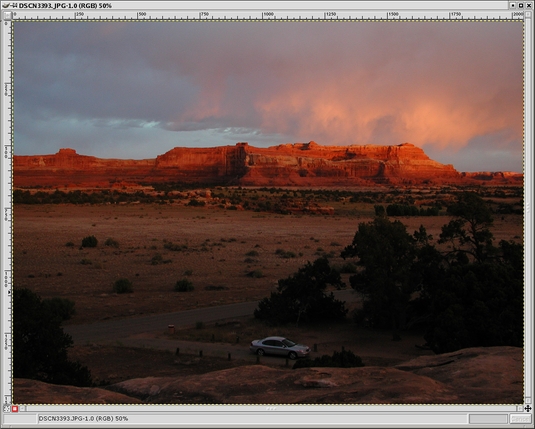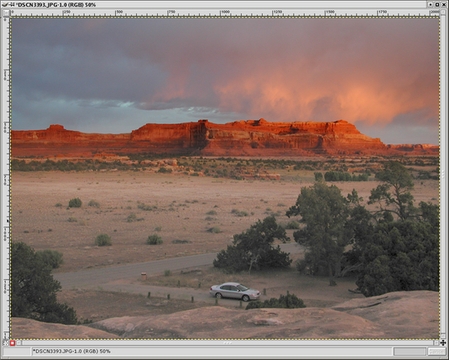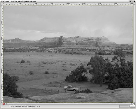 Let me illustrate with the following example: a Utah sunset, shown in Figure 2 loaded into a GIMP window. I had followed the sage advice and exposed for the clouds and highlights on the cliff face and allowed the foreground to go quite dark. Using the LAB decompose plugin, I can decompose this RGB image into the LAB constituents. Of these, the L channel shows the full range of luminance values carried in the image. As you can see from Figure 3, there is a considerable amount of detail in the foreground trees, which in the original image look almost completely blocked up. This is good, but how do I pull out this detail, while retaining the beautiful detail and color of the cliffs and clouds?