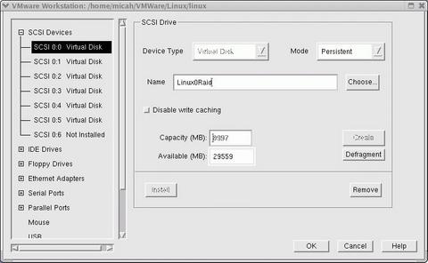 In order to configure my Linux VM to match my physical machine as closely as possible, I created six 9GB SCSI drives (Figure 1). One of the nice things about creating the virtual drives is they do not initially take up as much space as you assign to them. Instead, the files grow to accommodate data placed on them inside the VM. So, as far as the VM is concerned, it has 54GB at its disposal. But the complete test installation takes up about 1GB of physical space from my actual hard drive.