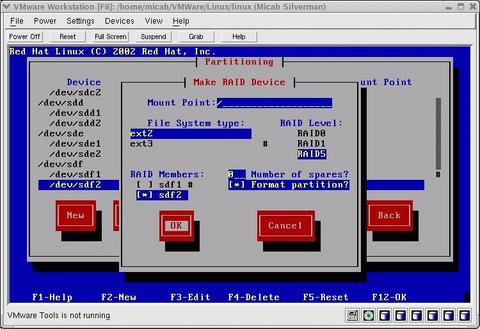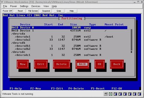 After configuring VMware to reference the physical CD-ROM drive for the VM's CD-ROM drive, I placed the first Red Hat 8.0 disk into the drive and powered on the VM. There are a few partitioning requirements at this step. First, each partition used in a RAID volume should be the same size. Second, one partition on one of the drives should be native and should mount at /boot. Third, for RAID 5, one partition's worth of space in a RAID volume needs to be "sacrificed" to account for parity (error correction) data. Because my physical machine has 512MB of RAM, I wanted to have 1GB of swap space. Table 1 shows my partitioning scheme.
