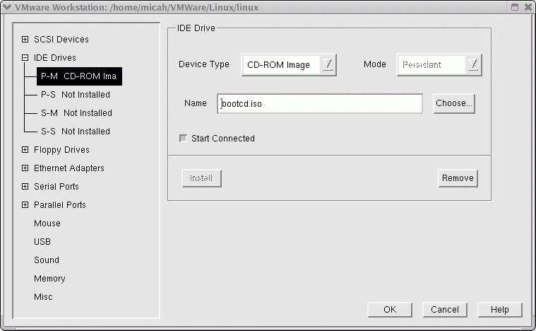For the second test, I "failed" the first drive in the array. For this test, we must have the bootable CD-ROM created earlier. It either can be burned onto a CD or the file can be referenced in the VMware configuration (Figure 4).