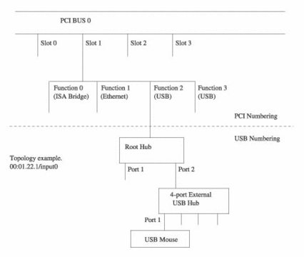 To understand what this string is showing, you need to break it down into parts. The usb part means this is a physical topology from the USB system. The 00:01.2 is the PCI bus information for the USB host controller (in this case, bus 0, slot 1, function 2). The 2.1 shows the path from the root hub to the device. In this case, the upstream hub is plugged in to the second port on the root hub, and that device is plugged in to the first port on the upstream hub. input0 means this is the first event device on the device. Most devices have only one, but multimedia keyboards may present the normal keyboard on one interface and the multimedia function keys on a second interface. This topology example is shown in Figure 1.