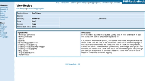 If you need to keep a recipe book, this is the ticket. You can input ingredients and the preparation process and save it. When you decide you want to cook something, the program can generate a list of ingredients in a shopping list and you can print it out. Now, if you could just ship it off via the Web to a local grocery store and have the ingredients delivered, you wouldn't even have to leave the house. Unfortunately, recipes are not included. Requires: web server with PHP and SQL (PostgreSQL or MySQL) support, SQL server and a web browser.