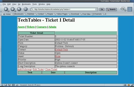 This particular trouble ticket and asset tracking system is a little different from some others. It deals fairly exclusively with trouble tickets and assets, not so much with clients and the the rest. Depending on your needs, this might fill the bill nicely. Installation and use is simple. If you need to protect anything, you'll need to implement htpasswords and/or secure web support (easily done). Requires: web server with PHP and SQL (PostgreSQL or MySQL) support, SQL server and a web browser.