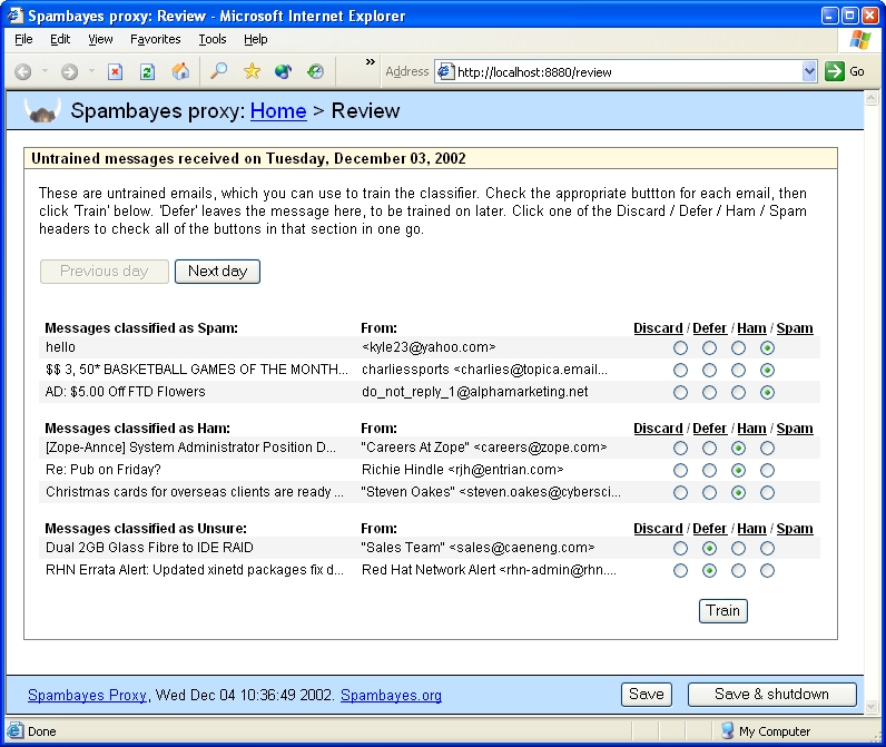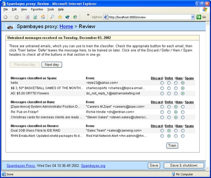 Once you're up and running, you can use the web interface to train the system on the messages the POP3 proxy has seen. The Review messages page lists your messages, classified according to whether the software thought they were spam, ham or unsure. You can correct any mistakes by checking the boxes and then clicking Train. After a couple of days (depending on how much e-mail you get), there'll be very few mistakes.