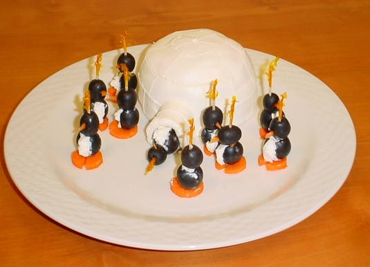 arrange_olive_penguins_about_cheeseball_igloo_on_serving_dish;\