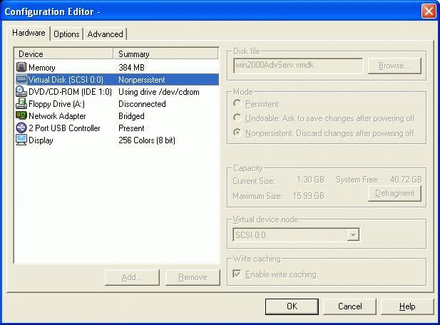 VMware uses something called disk modes in both its server and workstation products. These modes provide you with the ability to control which changes get written to disk within the virtual instance and which can be undone or rolled back. The three disk modes available are persistent, undoable and non-persistent. The first mode, persistent, is just what it sounds like it would be. Anything installed or changed on the instance (applications, configuration changes, etc.) is committed to disk as normal. As soon as the OS commits the data to the disk, it is there permanently (well, until it crashes).