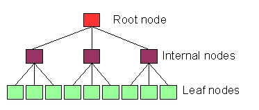 In Figure 1, the first graph is a four-level tree with a fanout of n = 1. It has only four nodes, starting with the (red) root node, traversing the (burgundy) internal and (blue) twig nodes and ending with the (green) leaf node, which contains the data. The second tree, with four levels and a fanout of n = 2, starts with a root node, traverses two internal nodes, each of which points to two twig nodes (for a total of four twig nodes) and each of these points to two leaf nodes for a total of eight leaf nodes. Lastly, a four-level, fanout of n = 3 tree is shown, which has one root node, three internal nodes, nine twig nodes and 27 leaf nodes.