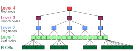 In Figure 6, a BLOB has been inserted into a leaf node of a four-level tree, meaning pointers to blocks containing the file data have been inserted into the leaf node. This is what a ReiserFS v3 tree looks like.